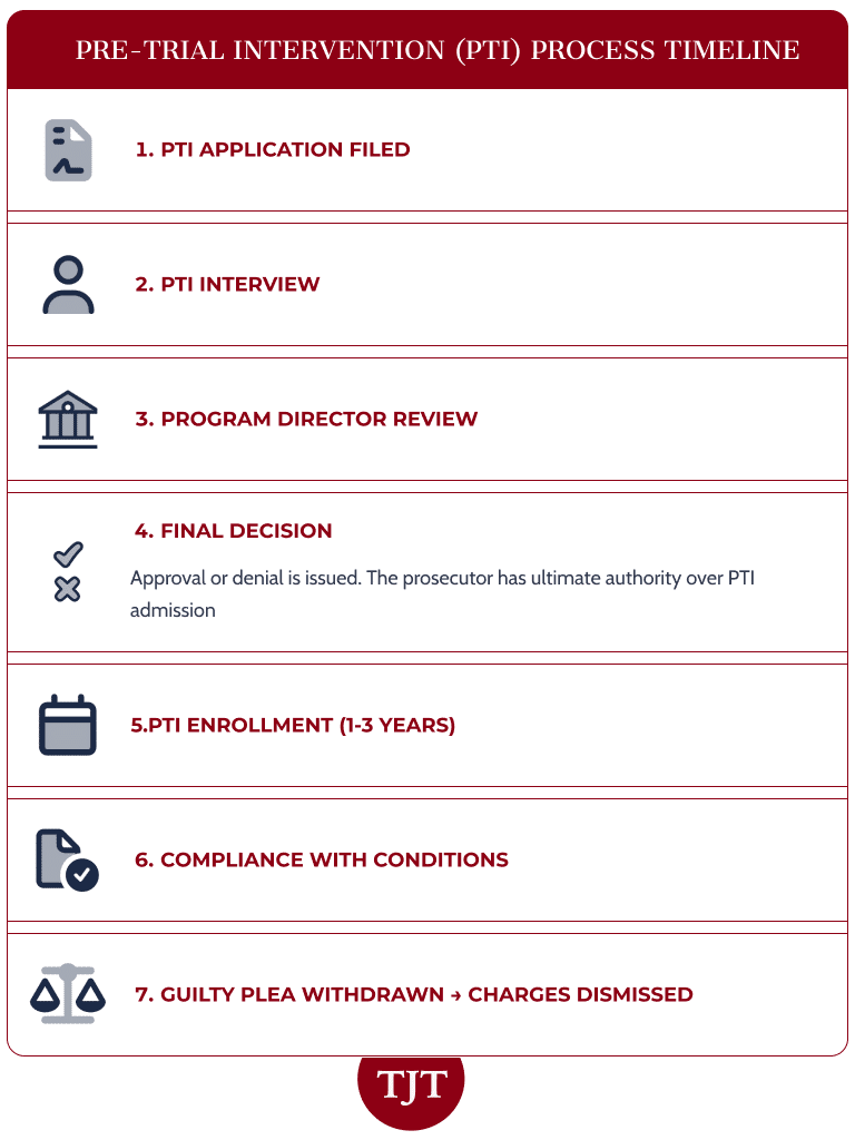 A defendant applies for admission to a PTI program early in the case, usually after indictment or during the pre-indictment phase. If approved, the defendant enters a guilty plea that is immediately placed on hold while they serve a period of supervised PTI, generally lasting between one and three years. During this time, the court monitors compliance with conditions such as counseling, no-contact requirements, random testing, employment, or payment of fees. Once the term is completed without violations, the plea is withdrawn and the charges are dismissed.